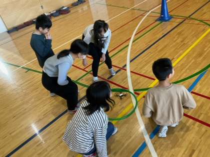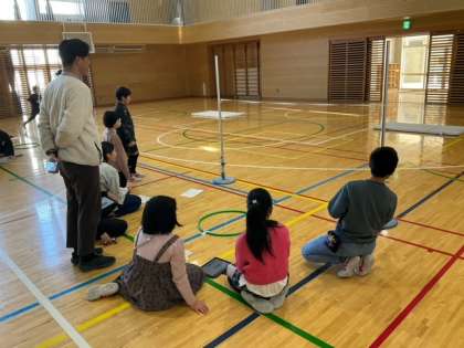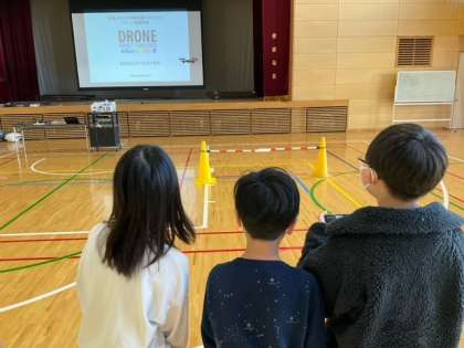 プログラミング体験の時間です。ドローンに挑戦しています。思ったとおりに動かすことができるでしょうか?