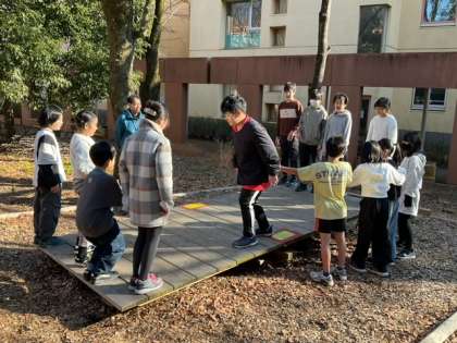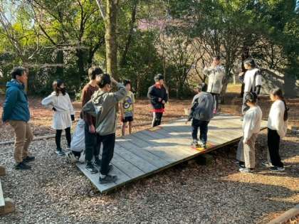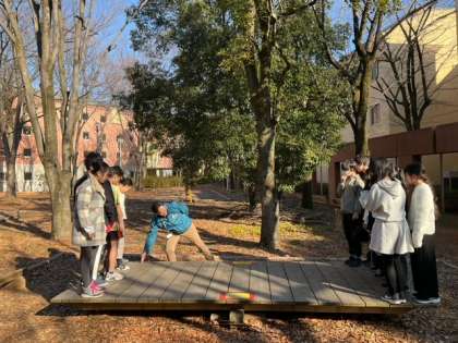 大きなシーソーが釣り合うように乗っていきます。傾いてシーソーが地面についたら不成功。メンバーは13人。チャレンジのチャンスは2回。知恵を出し合っています。