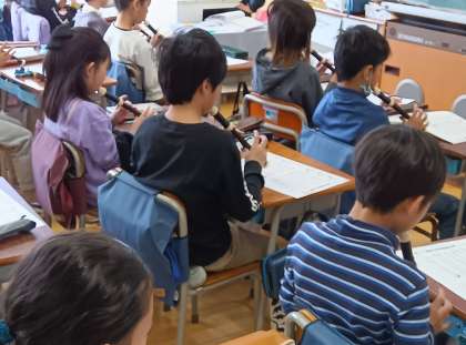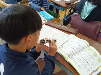 音楽の時間です。曲「パフ」をリコーダーで練習しました。重なり合う音を楽しんでいました。
