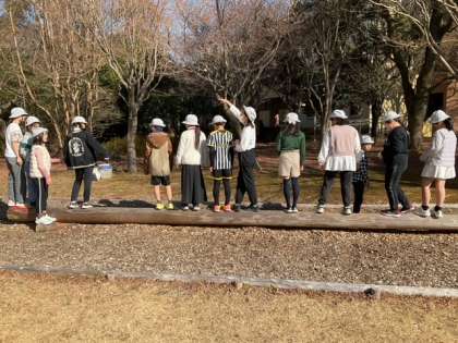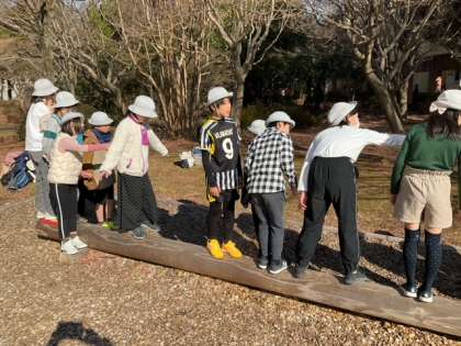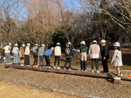 丸太の上にランダムに並んだ状態から、落ちないように誕生日順に並び直します。難易度の高いアクティビティですが、協力して大成功しました。