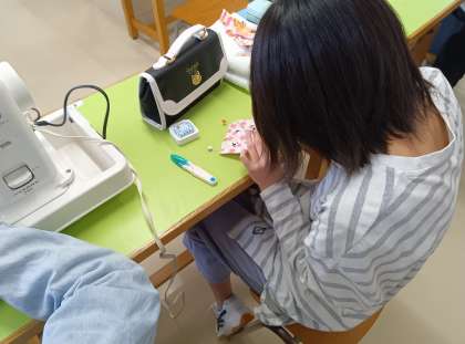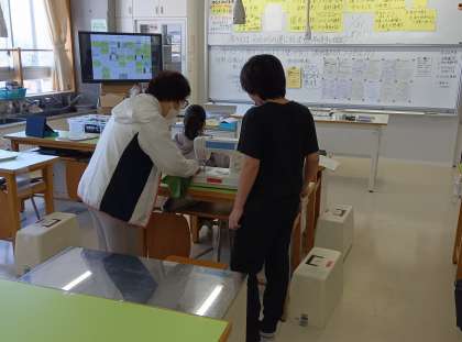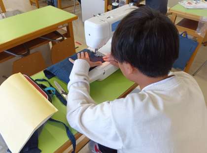 家庭科の時間です。家に残った布や地域の方にいただいた布を使ってペンケースやポーチなど、自分で考えてリメイクしています。