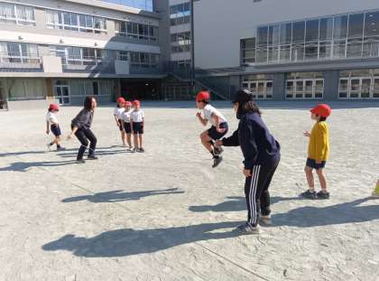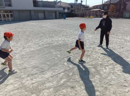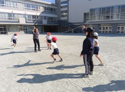 体育の時間です。縄に合わせて跳べるように、リズムと位置を考えて跳びました。