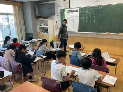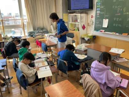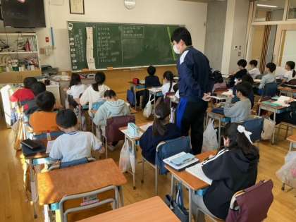 算数の時間です。5人がけの長いすが30脚あります。何人座れるでしょうか? あれ、2種類の式が出てきましたね。