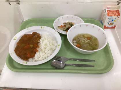 カレーライス ごまサラダ コンソメスープ 牛乳