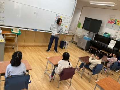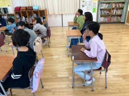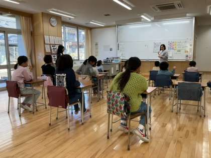 先生から今日の給食の食材について説明してもらいました。給食が楽しみですね。