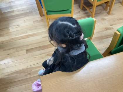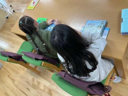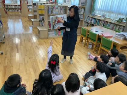 国語の時間です。司書の先生が「あかいてぶくろ」を読み聞かせてくれています。幸せについて考えさせられる物語です。