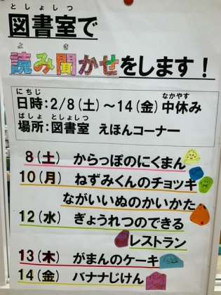 2月8日から図書委員会が企画した「読み聞かせ」が始まります。みなさん、図書室に集まってくださいね。