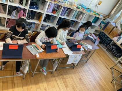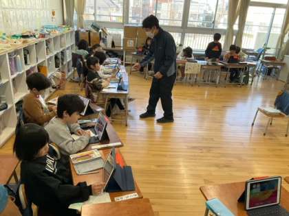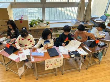 国語の時間です。「おみせやさん」の本番が近づいてきました。友達と相談したり、資料を調べたりと準備に力が入ります。