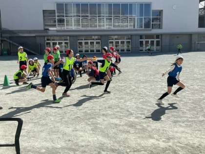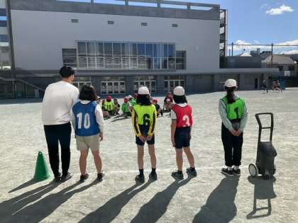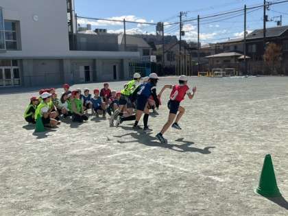 体育の時間です。4チームに分かれて、リレーに取り組んでいます。いい声が出ています。