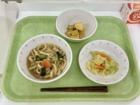 煮込みうどん塩だれキャベツのサラダキャラメルポテト牛乳
