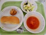 献立 米粉パン、フライドチキン、海藻とコーンのサラダ、ミネストローネ、セレクト飲...