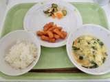 献立 ご飯、いかのチリソース、かぶの甘酢漬け、にらたまスープ、牛乳 <給食産地...