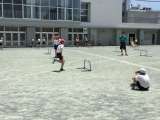 ハードル走に挑戦しています。グループに一台ずつデジタルカメラを配り、フォームなど...