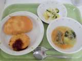 献立 柏パン、ポテトコロッケ、コールスローサラダ、大根スープ、牛乳 <給食産地...