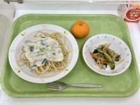 しめじと小松菜のクリームパスタもやしときゅうりのごま油和えみかん牛乳