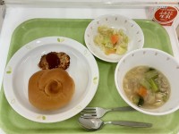 黒砂糖パン【リクエスト】チーズ入りハンバーグコーンサラダマカロニスープ牛乳