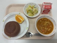 <献立>・ココアパン・ポークビーンズ・フレンチサラダ・清見オレンジ・牛乳 今日の...