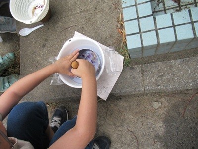 マヨネーズの空き容器に水を入れた水鉄砲で的当てをしたり、