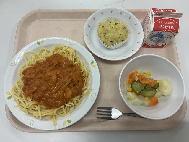今日は読書旬感の特別献立です。「きょうりゅうはポテトサラダがすき」という絵本に出てくる、ポテトサラダを給食風にアレンジして作りました。美味しく食べ、楽しい給食の時間になったらいいなと思います。
