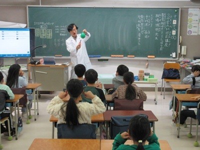 白衣を着た相場先生が教室に入ってきて実験道具を並べると、
