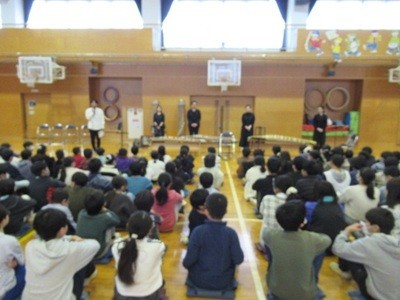 和楽器の素材や音程に関するクイズに正解して盛り上がった後、最後に祖師谷小学校の校歌を、琴と尺八の伴奏で歌いました。特別感のある校歌斉唱となりました。