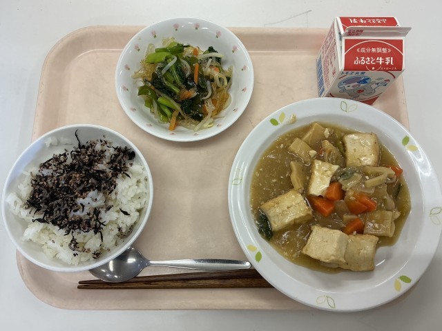 今日の給食には、3種類の寒天が使われています。ふりかけの中のひじき、和え物の中のわかめと糸寒天です。海藻には緑・黄緑・黒・白・赤など、色々な色があります。食感もそれぞれ違うので、たくさん食べて違いを感じてほしいです。