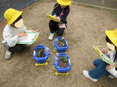 葉の香りをかいだり、自分や友達の植木鉢の様子をじっくりと見て、