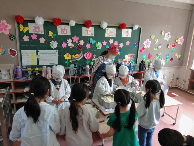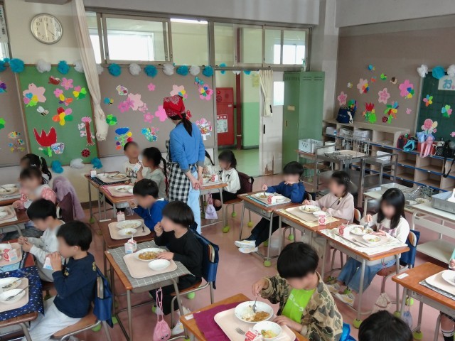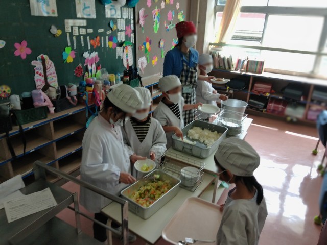 今日から給食が始まりました。1年生もスタートです。昨日、栄養士さんと一緒に学んだことを生かして、身支度を整えて配膳をします。地域の方による「給食ボランティア」さんが各学級に付いてくださり、給食当番のやり方を丁寧に教えてもらったり、食事中の見守りをしていただいたりとサポートくださっています。「おいしい!」の声がたくさん聞かれました。