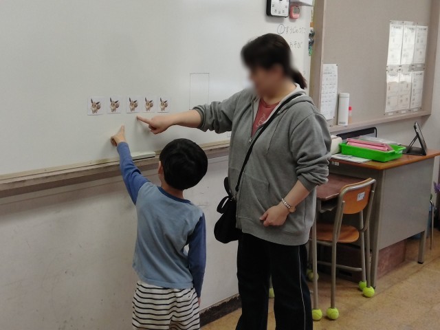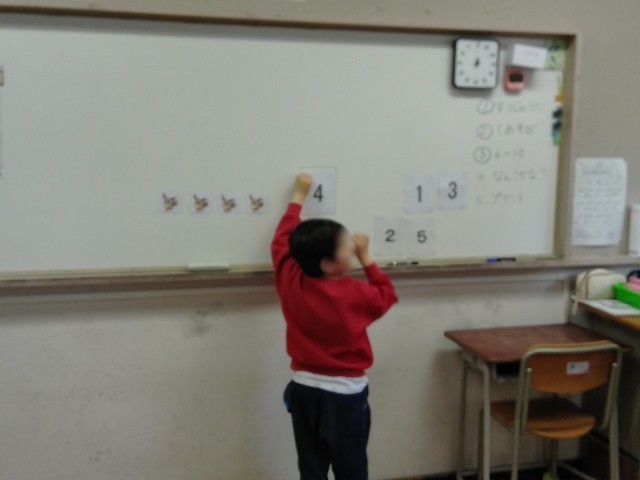 ぽぷら学級1年生の算数の学習です。5までの数を数えて、数字を答えていきます。みんな、しっかりできました!