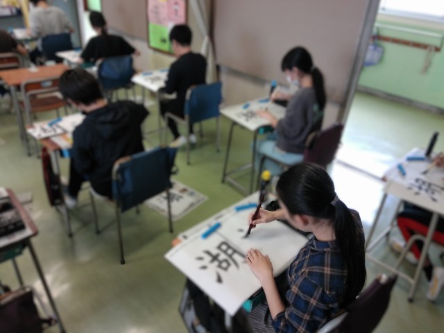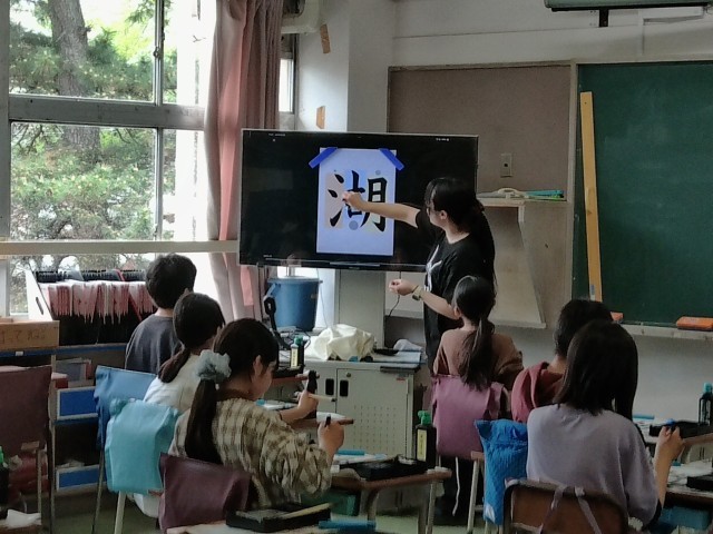 毛筆で「湖」の文字を書いています。3つの部分から成る漢字のバランスに気を付けて書くことをめあてに、集中して練習していました。
