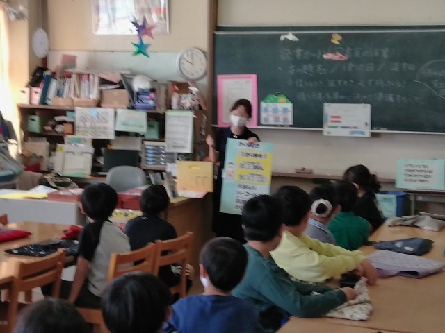 進級して初めての図書室での図書の時間です。図書館司書の先生に、図書室の利用の仕方や読書カードの書き方を教わりました。