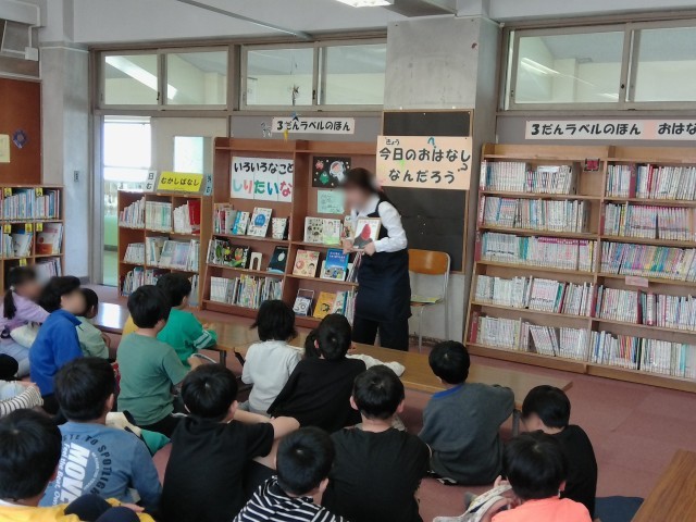 1年生から6年生までの全員での学習です。1年生にとっては初めての図書室。図書室の使い方を図書館司書の先生に教わり、読み聞かせもしていただきました。