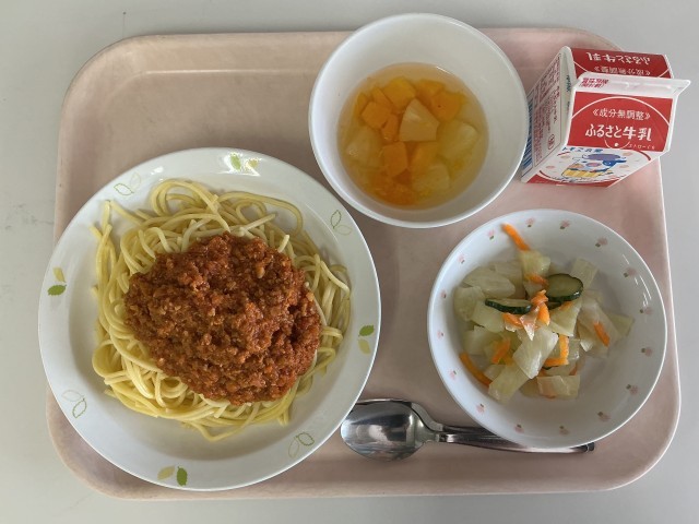 今日のミートソースは、給食室特製です。たっぷりの玉葱や豚ひき肉を使っています。また、トマトケチャップ・トマトペースト・トマト缶を使ってじっくり煮込んでいます。うま味がぎゅっと詰まったミートソースです。ミートソーススパゲティはパクパクと食べやすいですが、このような食べやすい献立の日こそ、よく噛んで食べることを意識してほしいなと思います。