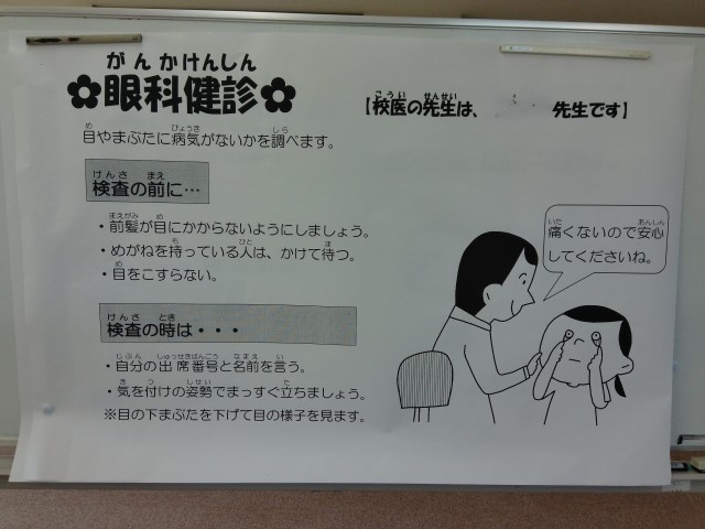 眼科健診 公開日 2026/04/22 更新日 2026/04/22 学校の様子 本校の校医の先生による眼科健診を実施しました。目やまぶたに異常がないか診ていただけました。1年生も上手に健診を受けることができました。 いいね(0)