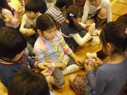 仲良くなって、学校をたんけんするために、2年生は1年生に「6角がえし」をプレゼントしました。「6角がえし」は内側からひっくり返すと万華鏡のように3面に描かれた絵が出てくるというびっくりおもちゃです。