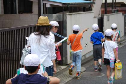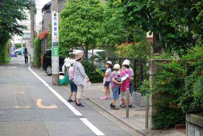 保護者の方々にもご協力いただき、グループに分かれて学校の周りを探検しました。