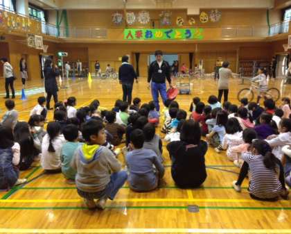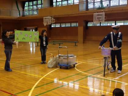 警察の方に来ていただき、体育館で交通安全教室を行いました。