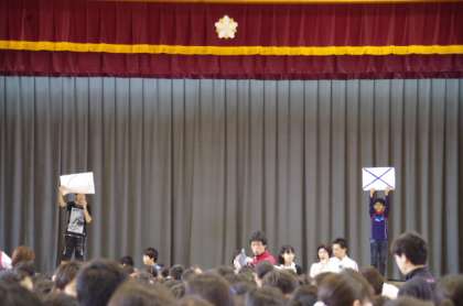 学校のことを中心にしたクイズを○×形式で問題にしていました。