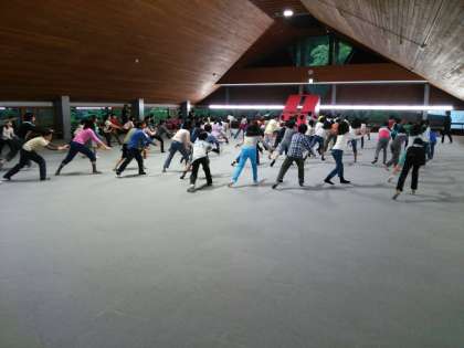 キャンプファイヤーが延期のため、室内レクに変更となりました。楽しくダンスをしています!