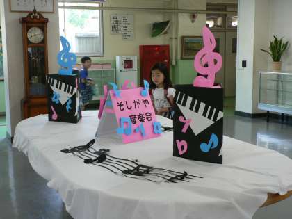 祖師谷小学校の昇降口エントランスのテーブルには、いつも素敵な装飾が施されています。今月6月はそしがや音楽会にかかわる装飾です。PTA有志の皆さんが校内美化活動に取り組んでくださっており、その一環として昇降口エントランスのテーブルを手作りのオブジェや草花で飾ってくださっています。心温まる素敵な装飾に、登校する子どもたちも立ち止まって見入っています。素敵な装飾をありがとうございます。