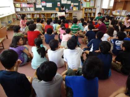 後ろのほうには六年生の姿も。静かに、そして真剣に聞きつつ、低学年が入室してくるとそっと体を倒して、前に座れるように通してあげる姿はさすがです!