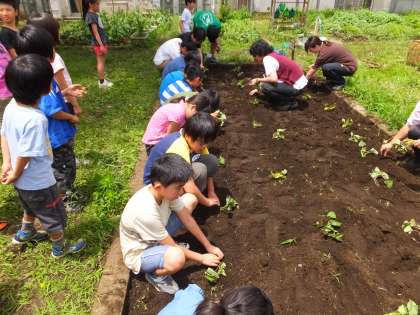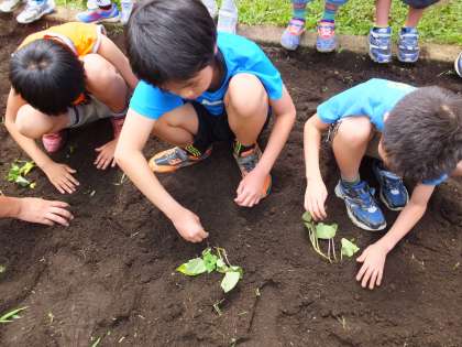 今年もさつまいもの苗植えをしました。日中の暑い中、協力して草むしりをして、一人ひとり想いを込めて小さな苗を植えました。