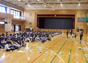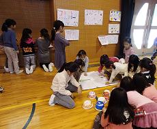 12月2日(火)の2,3時間目、1年生を招待して、体育館で「おもちゃ大会」を行いました。事前に生活科で数時間かけて作った、レーシングカーやコトコトハムスター、ストローアーチェリー等の手作りおもちゃ。作ったおもちゃの種類ごとにグループに分かれ、協力してお店を作りました。