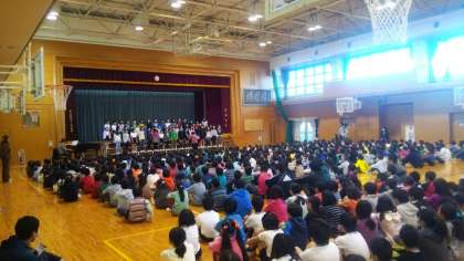 合唱団のきれいなハーモニーを聞いたあと、「すてきなともだち」を全校で合唱しました。