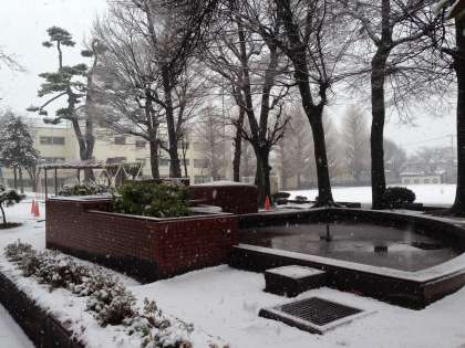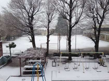 先週の金曜日には、雪が降りました。朝から教職員総出で校門や昇降口の雪を掃き、子供たちが安全に登校できるよう備えました。午前中は雪が降り続き校庭や校庭の木々は真っ白に、まるで雪国のようになりました。子どもたちは雪遊びをしたそうでしたが、雨になってしまったので遊べず、残念そうでした。