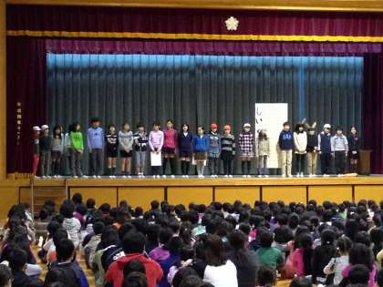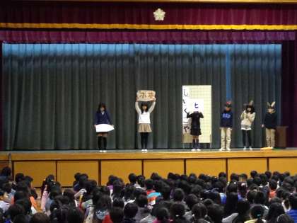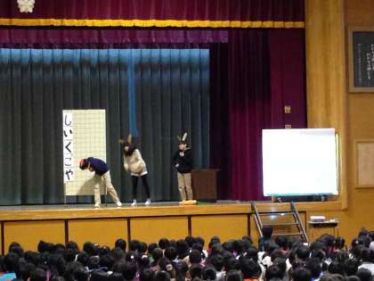 今日の児童集会は飼育委員会主催の集会でした。学校で飼育しているウサギに親しんでもらうために、飼育委員が寸劇やクイズでウサギのことを紹介してくれました。飼育委員は朝早くに登校して、準備やリハーサルなどを行い、本番も頑張っていました。これからも皆で学校のウサギをかわいがりましょう。
