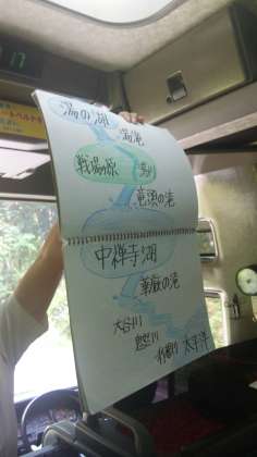 バスガイドさんが手作りのボードで川の様子を教えてくれました。