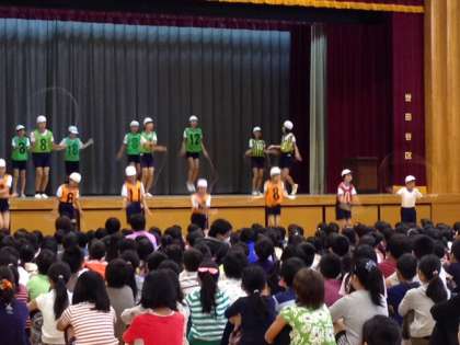 先週末で読書旬間が終わり、今週からは短縄週間が始まりました。今日の児童朝会では体育担当の先生から話があり、体育委員の子どもたちが跳び方の見本を見せてくれました。また、中休みには全校児童が校庭に出て、縄跳びカードに沿っていろいろな技にチャレンジしていました。これから毎日縄跳びを頑張り、いろいろな技をマスターできるといいですね。皆さん、頑張りましょう。