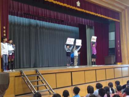 10月30日の朝、児童集会が行われました。今回は集会委員会による「クイズ集会」です。先生たちの出身地をヒントを聞きながら考えるクイズです。「○○先生の出身地は、△△が有名です」などのヒントで、皆は出身の都道府県を三択で答えます。地理の勉強にもなるクイズで、たいへん盛り上がりました。後期集会委員会の皆さん、ご苦労様でした。
