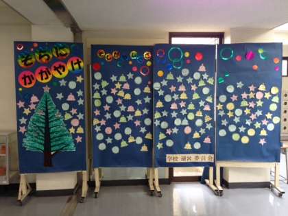 子どもたちと先生や主事さんが「さようなら、良いお年を」とあいさつを交わし、2学期が無事に終わりました。2学期もご支援とご協力をありがといございました。昇降口の「そらにかがやけそしがやしぐさ」も子どもたちのメッセージでいっぱいになりました。さて、明日から冬休みになります。楽しく充実した冬休みをお過ごしください。それでは、良いお年をお迎えください。